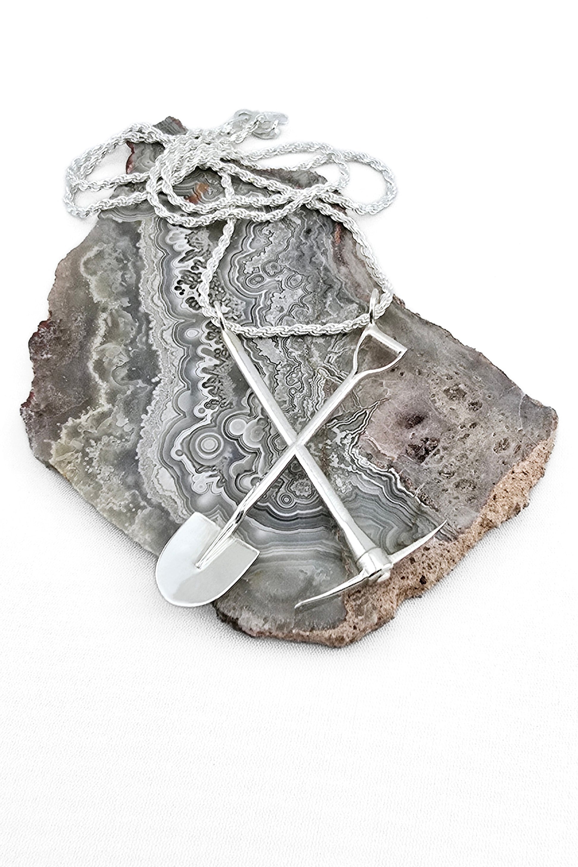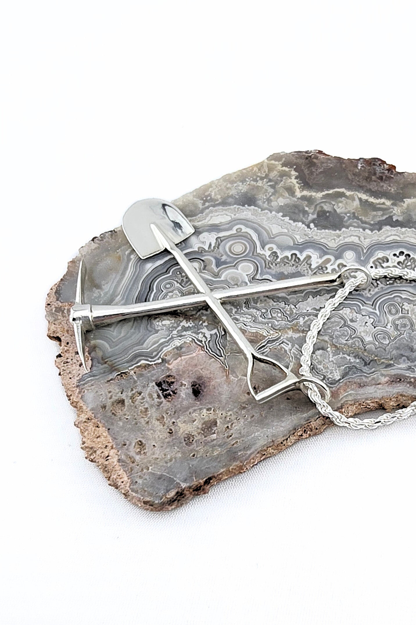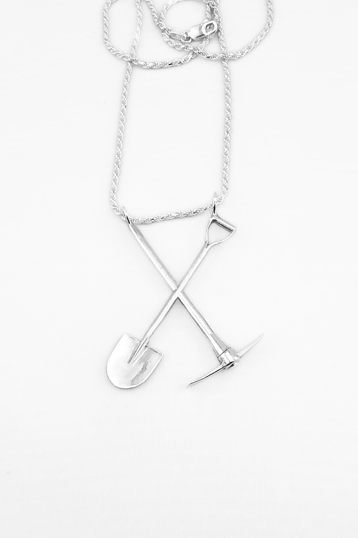 Crafted from sterling silver, this pendant features a bold crossed pick and shovel design, symbolizing strength, determination, and the spirit of adventure. The finely detailed craftsmanship highlights the timeless appeal of mining tools, making it a tribute to those who value perseverance and the thrill of discovery. Its polished finish not only ensures durability but adds an elegant touch, making it a meaningful keepsake for anyone passionate about the mining journey or the outdoors.