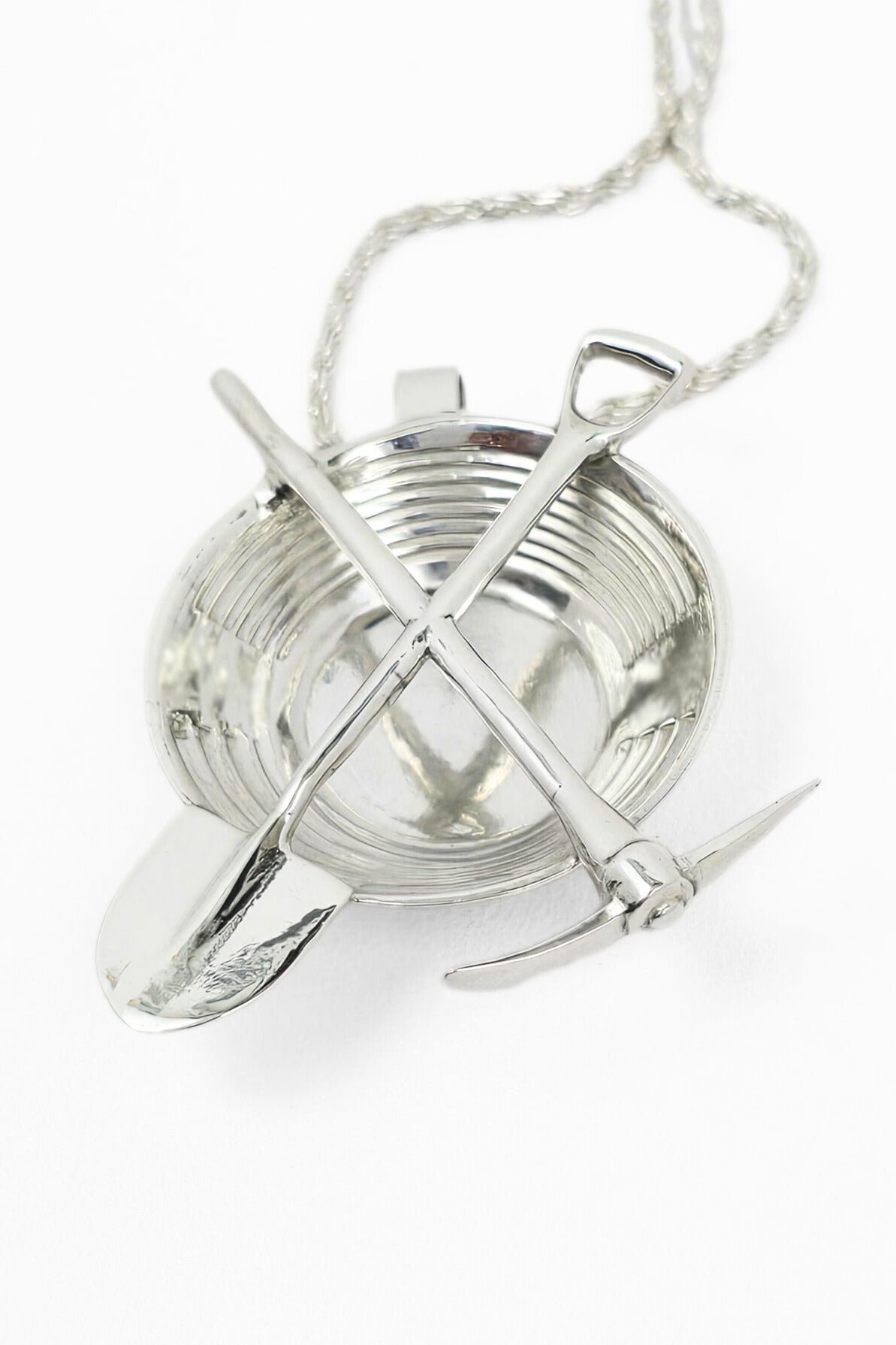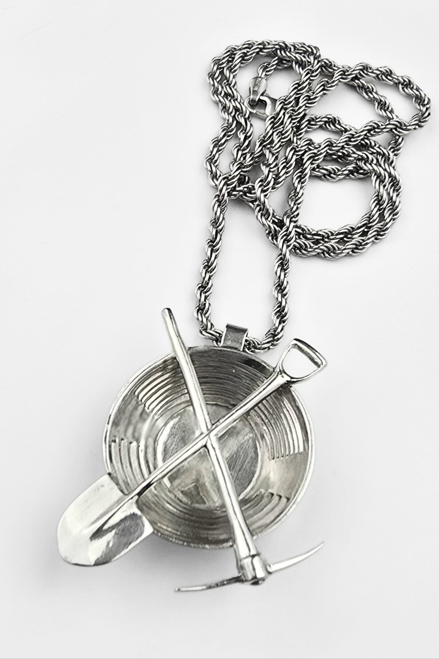 The sterling silver pick, pan, and shovel pendant is a bold and meaningful tribute to the miner’s journey. Crafted from high-quality sterling silver, this pendant combines three iconic tools—a pick, a pan, and a shovel—representing the hard work, determination, and skill of those who seek treasure from the earth. The intricate detailing brings each tool to life, capturing the essence of mining in every curve and line. Whether worn as a reminder of personal achievements or as a symbol of pride for those in the mining community, this pendant makes a timeless and rugged statement, celebrating the spirit of exploration and perseverance.